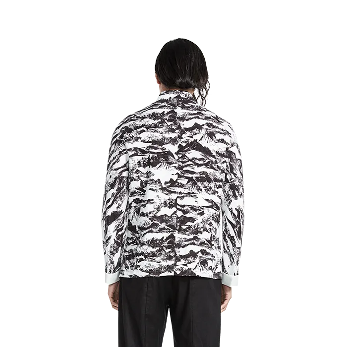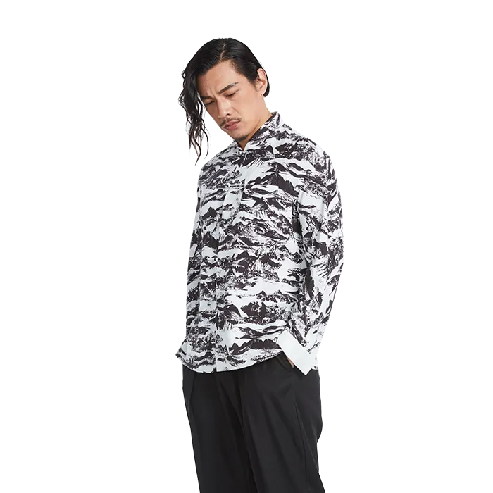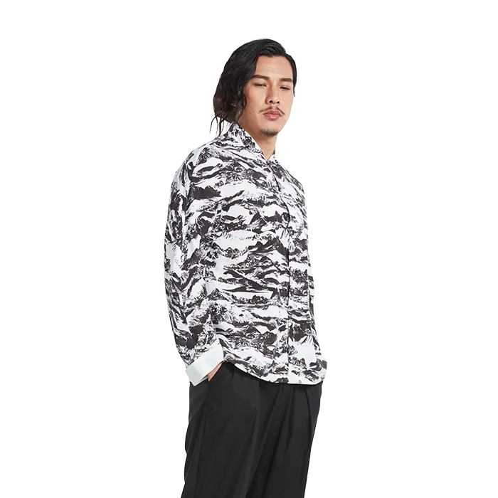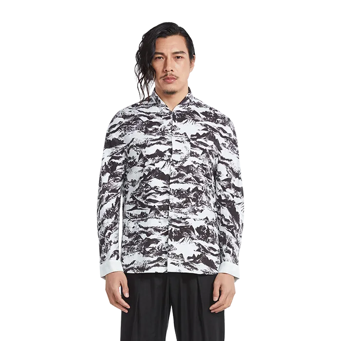 The jacket will carry you anywhere you want to go in harmony and serenity. Stand collar jacket with hand knotted loops and buttons. Long sleeves with rolled cuff in white. Overall print of Shan & Shui painting. Color: White ground with Black landscape print. Fabric: 55% Ramie 45% Lyocell.